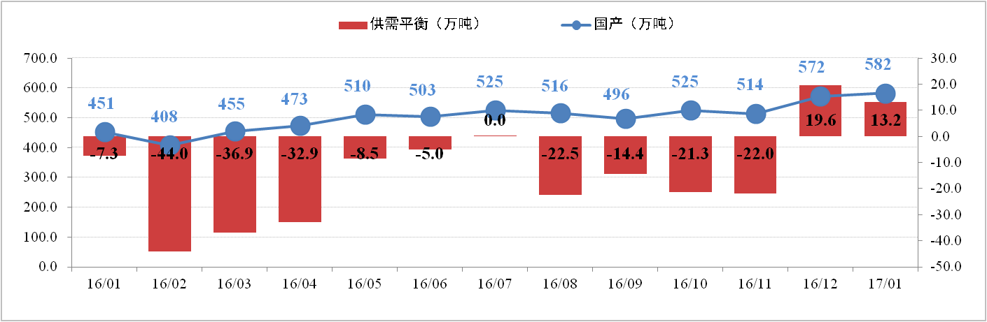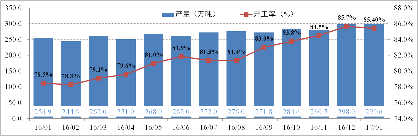 供給方面:2月10日,全國電解鋁有效產(chǎn)能為4,226.6萬噸,運行產(chǎn)能37萬37.5噸,開工率為88.42%。其中,1月份電解鋁總產(chǎn)量為299.6萬噸,供應持續(xù)增加。調(diào)研數(shù)據(jù)顯示,2017年電解鋁新產(chǎn)能已投產(chǎn)98.1萬噸,預計年度最終實現(xiàn)588.5萬噸;電解鋁復產(chǎn)21.2萬噸,預計年內(nèi)最終實現(xiàn)152萬噸。