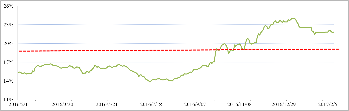 滬鋁三月比例價方面,2017年1月上期所三月期鋁結算價加權平均值為13,154.77元/噸,以17.6%作價2月份氧化鋁長單價為2,315元/噸,較1月份長單比例價上漲6.46元/噸。與現(xiàn)貨加權價格價差為654元/噸。1月份全國氧化鋁現(xiàn)貨加權價與滬鋁三月加權平均價實際折算比例為21.82%,較上月有所縮小。