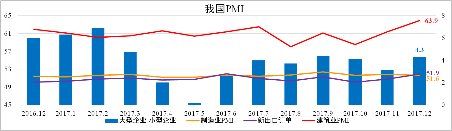 12月我國(guó)制造業(yè)PMI為51.6,較上月下滑0.2個(gè)百分點(diǎn)。其中,出口訂單繼續(xù)上升至51.9,顯示外需保持強(qiáng)勢(shì);大企業(yè)與小企業(yè)之差有所擴(kuò)大,表明在環(huán)保壓力下大型企業(yè)達(dá)標(biāo)能力強(qiáng);另外,建筑業(yè)意外錄得63.9的高位。