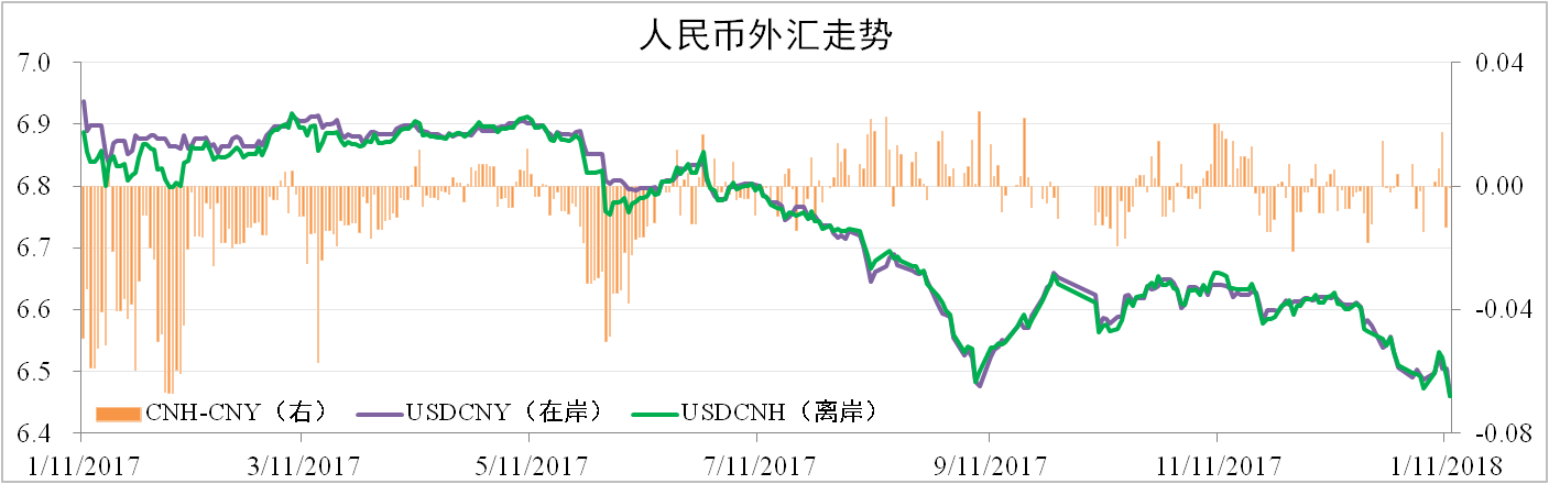 人民幣近期大幅上漲,截止2018年1月12日,在岸人民幣匯率為6.4606,環(huán)比升值2.43%,離岸人民幣匯率為6.4605,環(huán)比升值2.51%。1月9日央行通知部分中間價(jià)報(bào)價(jià)行對(duì)逆周期因子進(jìn)行調(diào)整,調(diào)整后相當(dāng)于無(wú)逆周期調(diào)節(jié)。