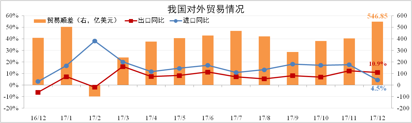 分析認(rèn)為:內(nèi)需轉(zhuǎn)弱導(dǎo)致原材料進(jìn)口量大幅下降致使進(jìn)口增速大幅下滑。美國(guó)頻繁挑起貿(mào)易摩擦?xí)?duì)我國(guó)2018年出口造成影響,而國(guó)內(nèi)經(jīng)濟(jì)增速趨緩致使進(jìn)口增速也面臨回調(diào)壓力。預(yù)計(jì)2018年進(jìn)出口雙雙回落。