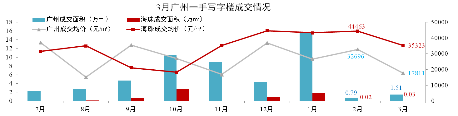 3月,廣州一手寫字樓成交1.51萬m²,環(huán)比上升23%,成交均價17,811元/m²,環(huán)比下跌36%。其中海珠區(qū)成交0.03萬㎡,環(huán)比上升50%,成交均價35,323元/㎡,環(huán)比下降21%。