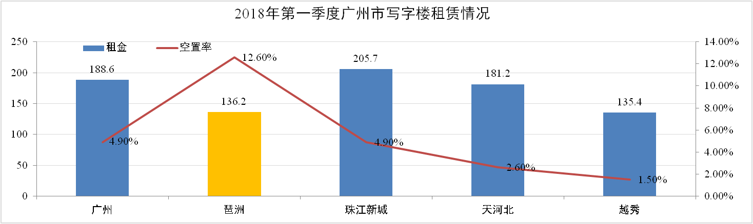 根據(jù)戴德梁行《2018年廣州市第一季度寫字樓速遞》報告,2018第一季度廣州市甲級寫字樓租金為188.6元/㎡/月,環(huán)比上升3.9%;琶洲市場平均租金136.2元/㎡/月,環(huán)比上升4.9%。全市空置率為4.9%,琶洲空置率為12.6%。