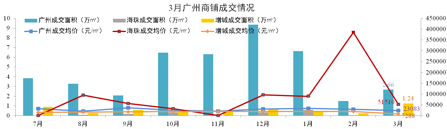 3月廣州一手商鋪成交2.66萬㎡,環(huán)比增加88%。海珠區(qū)成交0.01萬㎡,增城市場成交1.24萬平米,環(huán)比上升474%。全市成交均價23,083元/㎡,環(huán)比下降18%,海珠區(qū)均價51,510元/㎡,增城區(qū)均價7,288元/㎡。