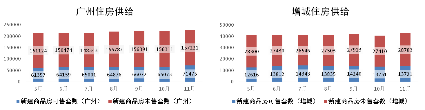 分析認(rèn)為:由于本月全市住宅成交整體下降,加上供應(yīng)保持水平量,致使市內(nèi)庫存量上漲。同理,增城在11月以等待政策優(yōu)化為主基調(diào),各樓盤推貨明顯放緩,區(qū)內(nèi)庫存較上月有所增加。
