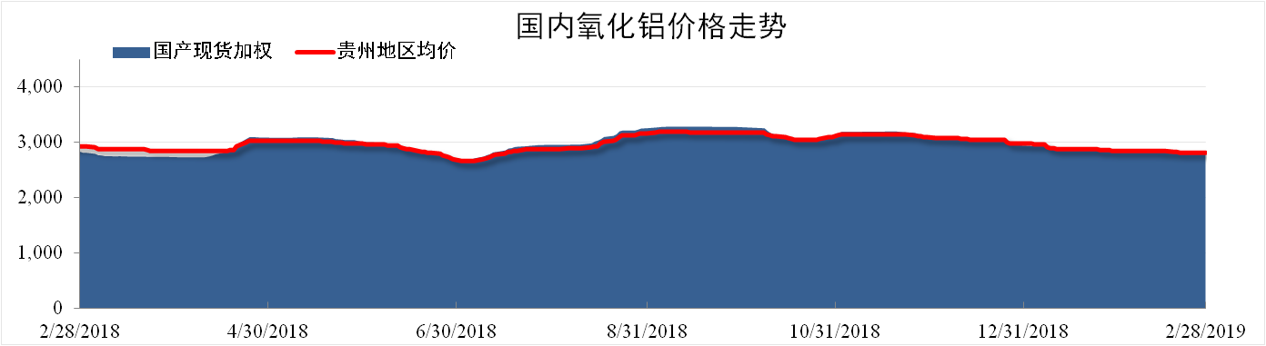 截至2月28日,國產(chǎn)氧化鋁現(xiàn)貨加權(quán)均價(jià)為2812元/噸,同比下降0.81%,環(huán)比下降2.18%。貴州地區(qū)氧化鋁現(xiàn)貨加權(quán)均價(jià)為2829元/噸,同比下降3.37%,環(huán)比下降2.22%。
