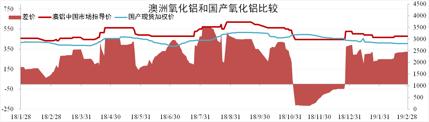 分析認(rèn)為:2月受國內(nèi)氧化鋁價(jià)格回落影響,與進(jìn)口氧化鋁價(jià)格差倒掛結(jié)束。2月國產(chǎn)氧化鋁價(jià)格持續(xù)回落,澳鋁中國市場(chǎng)指導(dǎo)價(jià)波動(dòng)較小,預(yù)計(jì)進(jìn)口氧化鋁價(jià)差緩慢拉大。