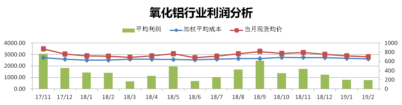 分析認(rèn)為: 2月礦石價(jià)格基本維持在高位,沒有太大浮動(dòng),但由于市場(chǎng)上堿價(jià)格持續(xù)下滑,整體氧化鋁成本小幅下行。因氧化鋁價(jià)格近期徘徊在低位,氧化鋁企業(yè)漲庫,氧化鋁利潤空間縮窄。