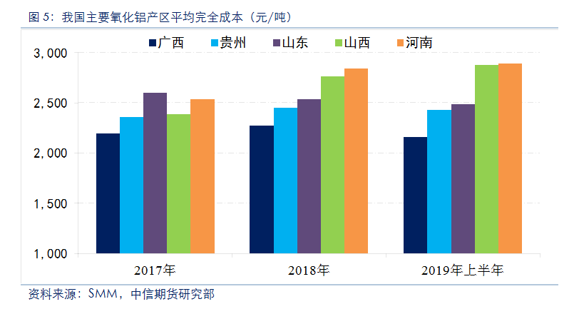 海關(guān)數(shù)據(jù)顯示,2014年以來,我國鋁土礦進口保持穩(wěn)步增長。2018年,我國氧化鋁產(chǎn)量約為7200萬噸,鋁土礦產(chǎn)量約1億噸,2018年全國進口鋁土礦約占國內(nèi)礦石總供應(yīng)量的42%。海外礦石因儲量豐富、開采成本低、礦石品位較高等優(yōu)勢逐漸受到國內(nèi)氧化鋁企業(yè)的青睞,另外,隨著山西地區(qū)資源過度開采,鋁土礦品位下降,山西政府有保護省內(nèi)資源的意愿,預(yù)計該地區(qū)礦石開采將繼續(xù)受到限制,進口礦使用將逐漸成為主流。
